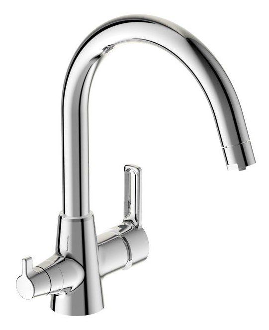 Robinet avec bec en forme de C et possibilité de connecter un filtre pour l'eau potable. L'aérateur autonettoyant est équipé de deux sorties : au centre - pour l'eau potable, autour de la circonférence - pour l'eau du robinet. La conception de ce modèle implique le raccordement d'une vanne de fond de pression, si nécessaire. La course douce de la poignée vous permet de régler avec précision la température et la pression de l'eau.