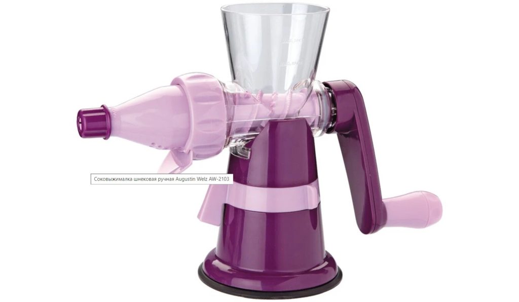 Un appareil simple et fiable qui convient non seulement aux légumes et aux fruits, mais aussi aux herbes. La conception la plus simple, dans laquelle il n'y a rien à casser, est facile à nettoyer et conserve longtemps sa présentation. Fonctionne comme une presse. Les produits ne sont pas exposés à des effets thermiques nocifs ou autres, ce qui vous permet d'obtenir une boisson savoureuse et saine.