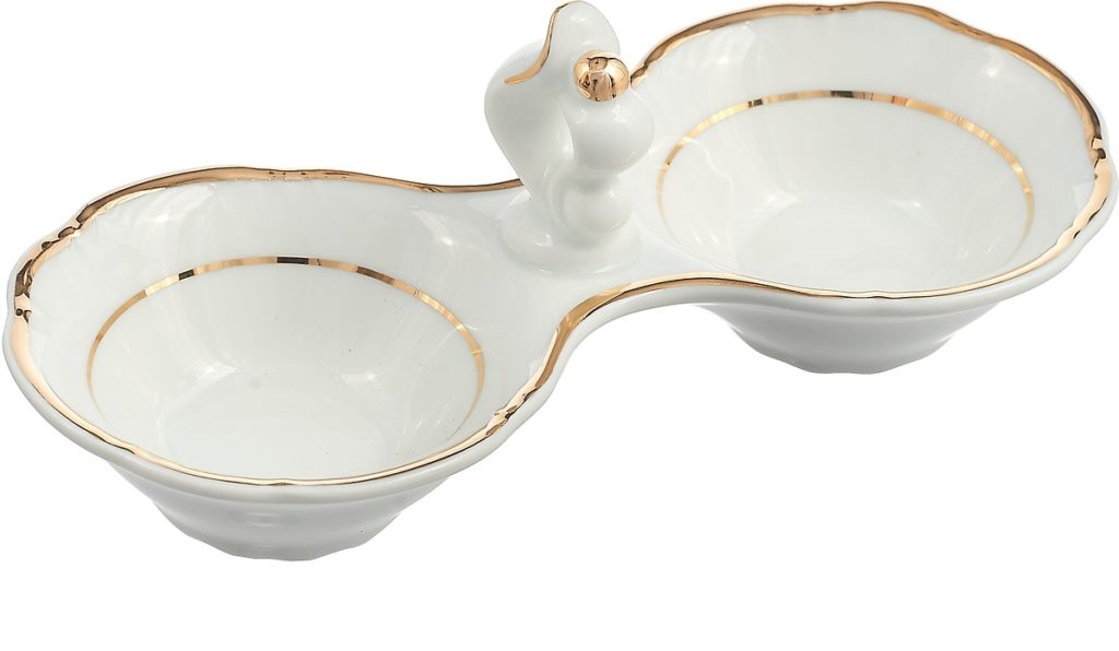 Une salière double est la solution parfaite pour un grand festin. Malgré le fait que le produit soit ouvert, cela ne réduit pas la popularité du modèle. Deux petits bols à épices sont reliés l'un à l'autre et conviennent aux amoureux du style classique.