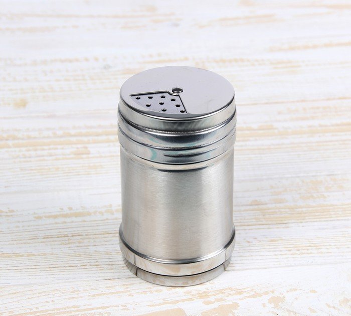 Le produit est fait de métal fin, donc même en cas de chute, il n'est pas endommagé. La hauteur du produit est de 8 cm, donc l'article ne prend pas beaucoup de place. Le couvercle se ferme hermétiquement, les ouvertures spéciales pour le sel peuvent être fermées avec une valve spéciale. Cela empêche les épices de se mouiller et de s'agglutiner.