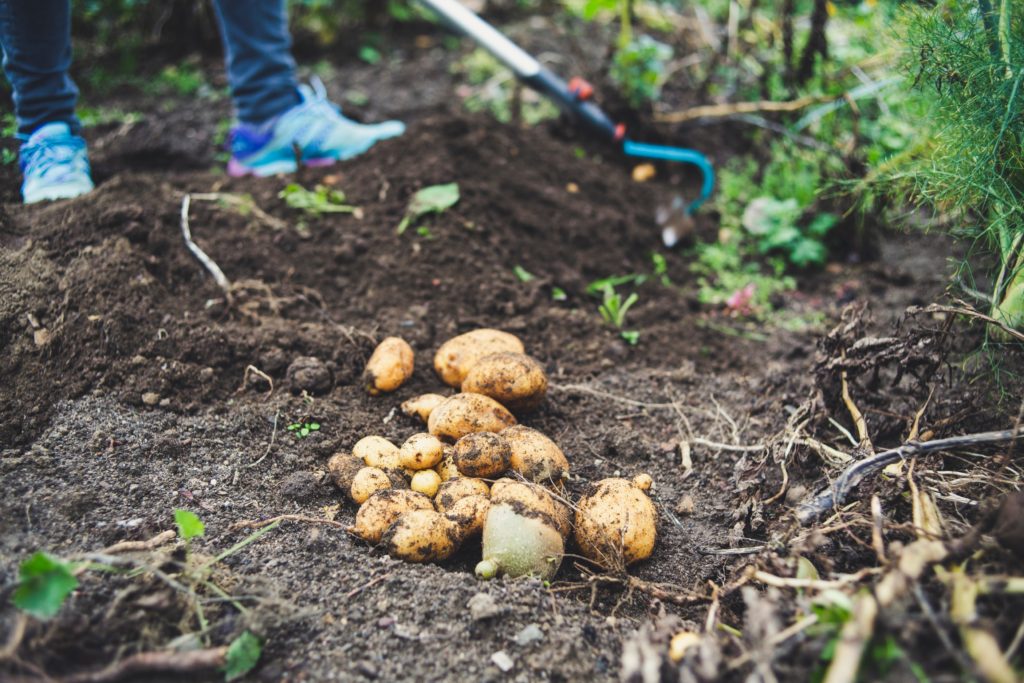 Mais la meilleure façon de savoir si les pommes de terre sont mûres est de déterrer périodiquement les arbustes à différents endroits du site. Journée sèche et ensoleillée avec une température de + 10 ° C le matin, vous pouvez commencer à récolter les pommes de terre. Dans ce cas, le légume est facile à nettoyer de la saleté. Cela doit être fait très soigneusement, en protégeant les tubercules autant que possible. Sur les sols meubles, cela peut être fait avec une fourche. Sur limoneux - avec une pelle.
