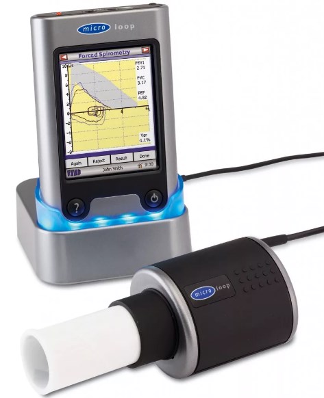 De petite taille, mais impressionnant dans ses fonctions de mesure, est un spiromètre portable de Micro Loop. L'appareil se compose de deux parties - une unité de contrôle avec un moniteur couleur et un capteur bidirectionnel. Le modèle offre de nombreuses possibilités de mesurer les principaux paramètres ; avec son aide, 13 caractéristiques d'inspiration et d'expiration sont déterminées et enregistrées. Il est à noter qu'il n'est pas nécessaire de vérifier l'étalonnage de l'appareil à chaque fois (il ne ressent pas les changements d'humidité et de température), mais un étalonnage périodique est toujours nécessaire. Pour faciliter l'utilisation, l'appareil est équipé d'un écran couleur haute résolution. La commande de l'appareil et le choix des fonctions s'effectuent au moyen d'une micro-souris ou d'un stylet. La communication avec l'ordinateur s'effectue via un connecteur micro-USB. Le logiciel PC Spirometry permet l'analyse et l'interprétation des données obtenues au cours de la recherche, mais il convient de noter qu'il n'est pas inclus dans le package de base. La mémoire intégrée est conçue pour 2500 tests. Le gros avantage du modèle est le texte animé intégré pour la spirométrie chez les enfants. Alimenté par une batterie rechargeable, qui est rechargée via la station d'accueil à partir d'un réseau 220 V.