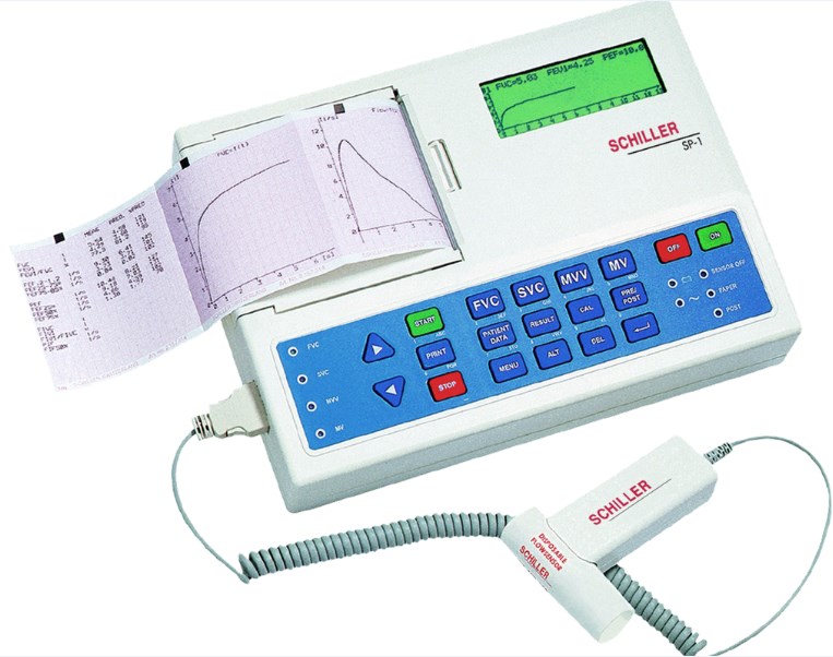 Spirovit SP-1 est un analyseur spiro du célèbre fabricant suisse d'équipements médicaux SCHILLER. Avec lui, vous pouvez mesurer tous les indicateurs de la fonction de la respiration externe conformément aux normes européennes. Le modèle est conçu comme un modèle stationnaire alimenté par un secteur domestique, mais si nécessaire, il peut fonctionner à partir de batteries rechargeables intégrées. Il combine dans un seul boîtier tous les composants nécessaires - un écran, une unité de mémoire, une batterie, une imprimante. Il est à noter que vous pouvez obtenir un rapport quelques secondes seulement après les mesures et dans un format pratique. La communication avec le PC s'effectue via le connecteur RS232. Les données obtenues lors de la spirométrie peuvent être exportées vers divers éditeurs de texte et graphiques.