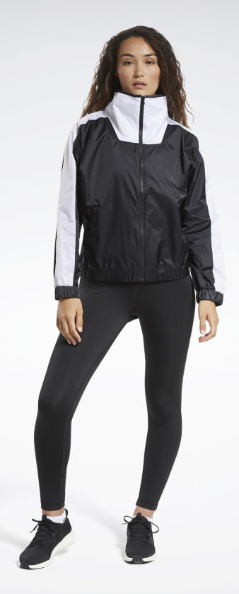 Le costume est parfait pour l'entraînement en plein air à la fin du printemps et au début de l'automne. L'ensemble se compose d'une veste et d'un legging. Il existe deux options de couleur : noir et blanc et violet et noir. Dans le même temps, dans les deux versions, les leggings sont fabriqués dans un monocolore - noir. La veste a une fermeture éclair entièrement détachée, sur les manches et sur le bas il y a une bande élastique. Style - libre, raccourci. Le cou est protégé du vent par un col montant montant de couleur contrastée. Le logo de la marque est au dos.