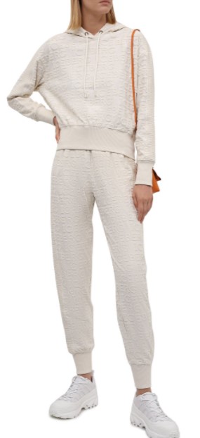 Un ensemble en coton (75%) séduit par sa simplicité en terme de design et sa qualité irréprochable. Le matériau doux à partir duquel le sweat à capuche est cousu présente un motif texturé sous la forme d'une inscription avec le nom de la marque sur toute la surface. Les manches sont abaissées, ce qui ne permet pas la moindre contrainte de mouvement.
