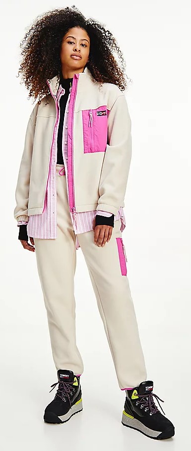 Cette image n'est pas vendue par la marque, car un seul costume, une veste olympique et un jogging sont vendus séparément. Le fabricant propose également de combiner une chemise olympique avec une jupe en jean, ce qui donnera un look vintage dans l'esprit des années 80 du siècle dernier.