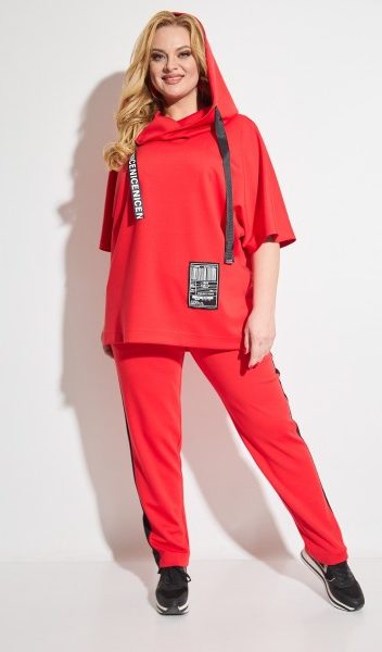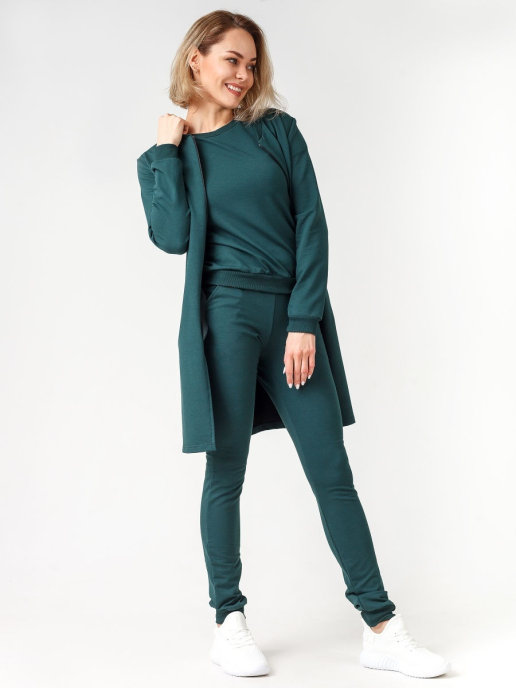 Ce modèle ne se positionne pas comme exclusivement pour les dames aux formes luxueuses et est admis dans une gamme de taille allant du XS au 4XL. Ce modèle convient au "pyshechek" et est équipé d'un cardigan à coupe libre. La coupe droite et la longueur aux genoux allongent visuellement la silhouette et affinent son propriétaire. En plus du cardigan, le kit comprend un T-shirt à manches courtes : encolure - sous la gorge, bande élastique en bas ; pantalon - sur une bande élastique, avec des poignets élastiques par le bas. La matière est agréable au corps, douce, le tissu est une combinaison de coton (70%) avec du polyester et du lycra.