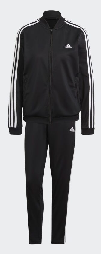Un survêtement classique inspiré d'Adidas. Olympia avec une fermeture éclair avec un col montant et une bande élastique en bas a deux poches extérieures coupées, chacune se fermant avec une fermeture éclair. Le pantalon se distingue par une coupe resserrée vers le bas; en plus de la bande élastique, il y a un cordon de serrage sur la ceinture. Jeu de couleurs : noir et blanc. Le décor est reconnaissable à trois bandes sur les côtés du pantalon et sur les manches, ainsi qu'un logo sur le devant du sweat et du pantalon.