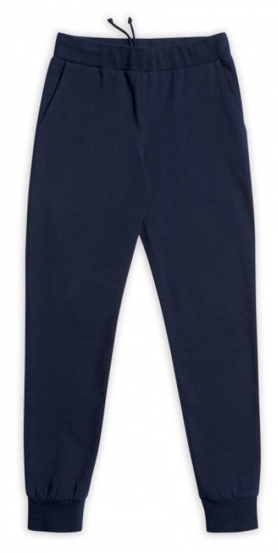 Taille élastiquée avec cordon de serrage pour une fixation supplémentaire.Il n'y a pas de motifs ou d'impressions sur le produit. Il y a des poches en biais sur les coutures latérales. Le bas des jambes est fini avec des poignets en tricot croisé.