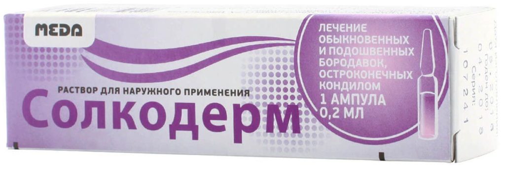 La zone touchée doit être traitée plusieurs fois avec de l'alcool avant d'appliquer Solcoderm. L'applicateur aidera à livrer le médicament au point de destination. Si le remède a fonctionné, la peau s'assombrira, il n'est pas souhaitable d'arracher la croûte, sinon il restera une cicatrice.