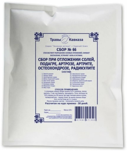 La collection est recommandée aux personnes de plus de 10 ans pour réduire les douleurs de la goutte, la sciatique, l'ostéochondrose, les dérèglements hormonaux. Stage d'accueil : 1 mois. Ne contient que des ingrédients naturels à base de plantes. Emballé dans un sac en plastique transparent. Poids : 100 gr. Coût moyen : 194 roubles.