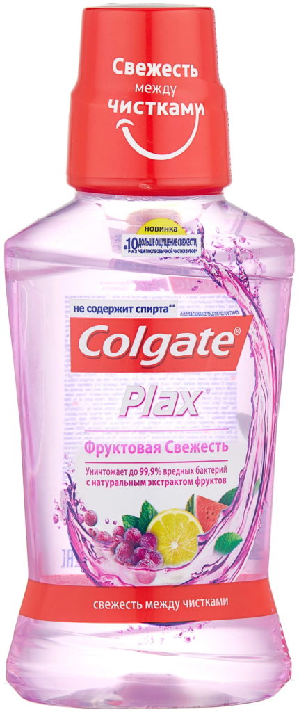 Colgate Plax Fruit Fresh avec extrait de fruit naturel combat les bactéries nocives. La composition contient du fluorure de sodium, qui protège contre les caries. Le médicament ne provoque pas de brûlure. La sensation de fraîcheur dure longtemps. Le spray ne contient pas d'alcool.