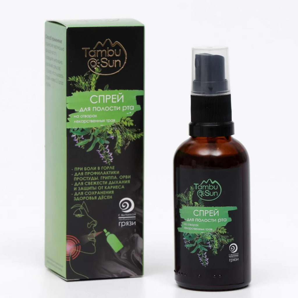 La composition à base de plantes du spray est utilisée pour prévenir les maladies des voies respiratoires supérieures et pour maintenir l'hygiène buccale. La composition comprend un extrait cicatrisant de boue Tambukan. Le tilleul renforce l'immunité. La menthe, la sauge et la camomille rafraîchissent et vous gardent confortable pendant des heures.