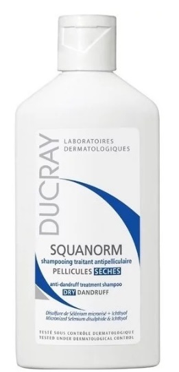 Le shampooing "Squanorm" du fabricant français convient à l'élimination des pellicules avec cuir chevelu sec. L'action du shampooing repose sur l'action de trois composants principaux. La présence de pyrithione de zinc aide à éliminer les champignons qui provoquent une desquamation excessive, le glycolate de guanidine prévient l'apparition de signes répétés de desquamation et la glycérine maintient un équilibre normal du cuir chevelu, l'hydrate et prévient le dessèchement. Lorsqu'il est utilisé sur des cheveux teints, la couleur ne changera pas. Il contient également de l'acide glycolique. Son action vise à restaurer les cheveux cassants, à améliorer la structure et l'apparence de la racine des cheveux.