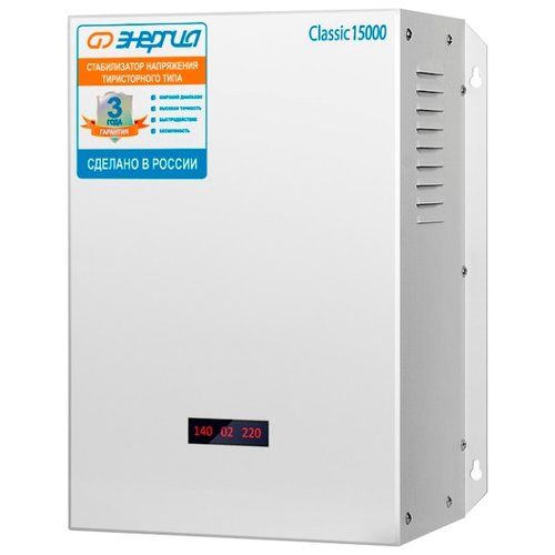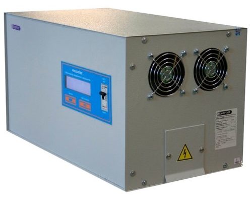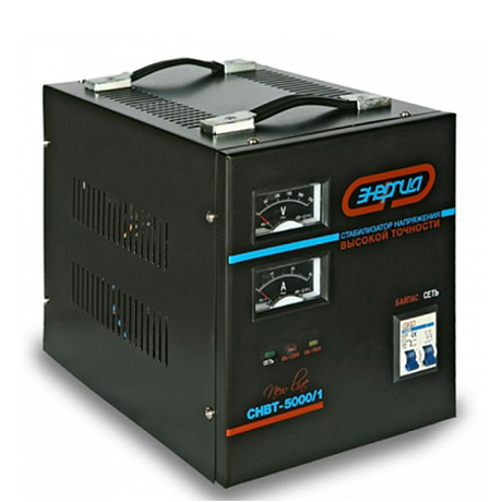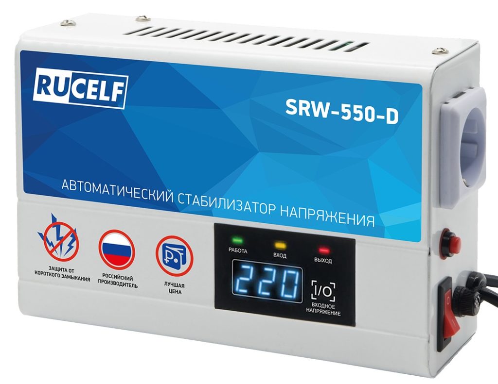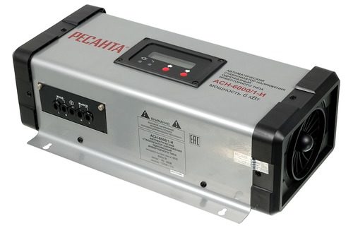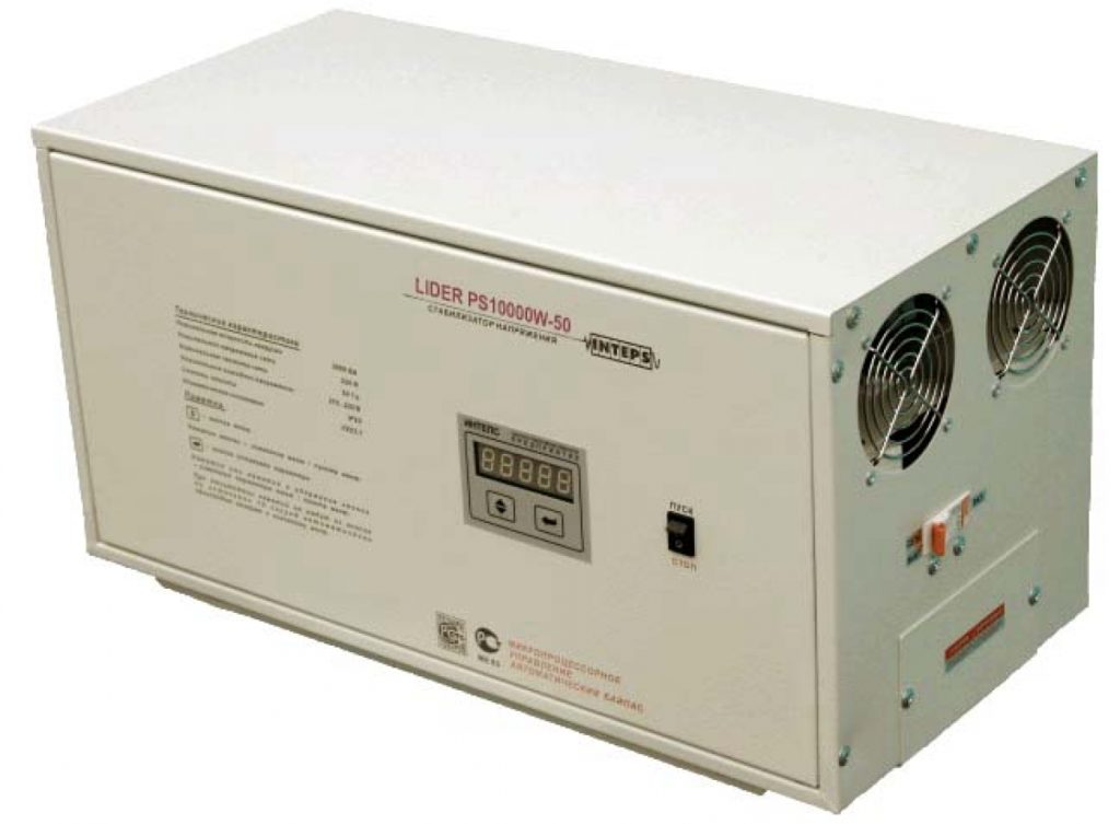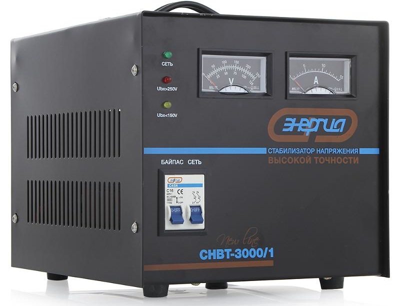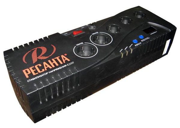 Stabilisateur hybride monophasé. Tension d'entrée et de sortie - 144 - 256 V et 105 - 280 V, respectivement. L'efficacité ici est très élevée - 98%. Il existe tous les types de protection qui ont été présentés ci-dessus. Sur le Led - l'écran affiche toutes les données sur l'appareil. Vous pouvez placer l'appareil sur le sol.