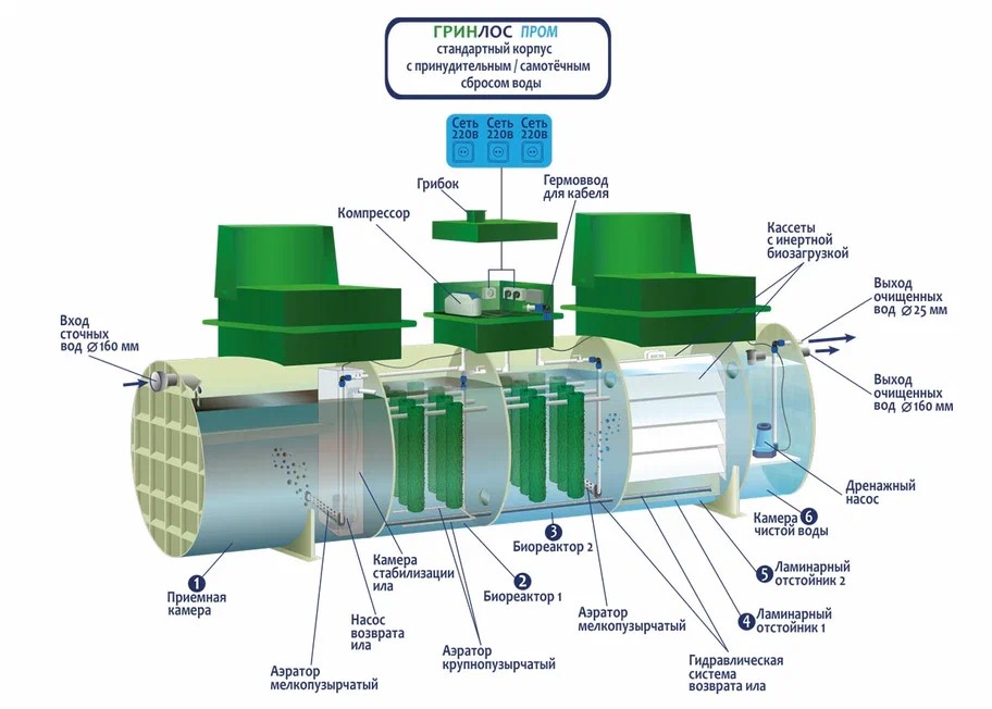 Modèles de production domestique pour le traitement des eaux usées dans les chalets, les maisons de campagne, les villages de vacances. Ils peuvent être utilisés dans des maisons destinées à la résidence permanente jusqu'à 150 personnes, avec une consommation d'eau quotidienne allant jusqu'à 30 000 litres et une décharge en rafale allant jusqu'à 4 600 litres. Le rejet d'eau purifiée s'effectue soit de force au moyen d'une pompe dans un réservoir ou un sol, soit par gravité dans un fossé de récupération, un puits de drainage ou un champ de filtration. Pour la fabrication du boîtier, un polypropylène intégral à trois couches est utilisé. Le compresseur est réglé sur un mode de fonctionnement constant, ce qui permet d'augmenter la durée de vie et les conditions confortables pour les bactéries. Garantie constructeur - 10 ans.