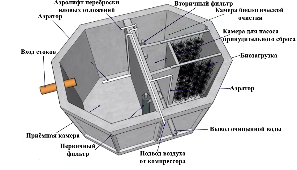 Le complexe comprend une chaîne d'équipements divers. La modification finale est déterminée par les besoins du client. Quel qu'en soit le type, la composition comprend plusieurs chambres ou modules dans lesquels les effluents pollués sont neutralisés. En règle générale, un appareil standard se compose des composants principaux suivants :