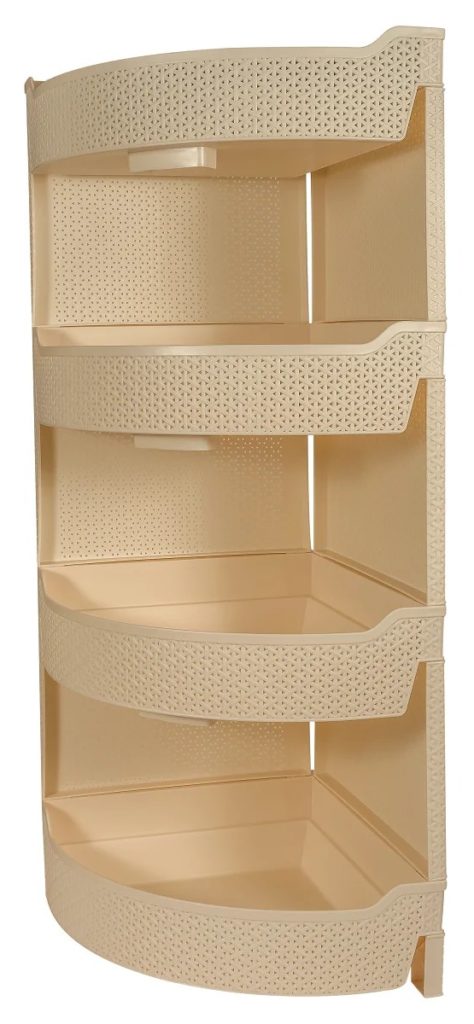 Quatre étagères semi-circulaires à l'avant ont des côtés en plastique ajouré et deux parois arrière faites du même matériau. Les contenants sont fabriqués selon le type de plateaux. Ils sont montés sur guides, faciles à démonter, à laver.