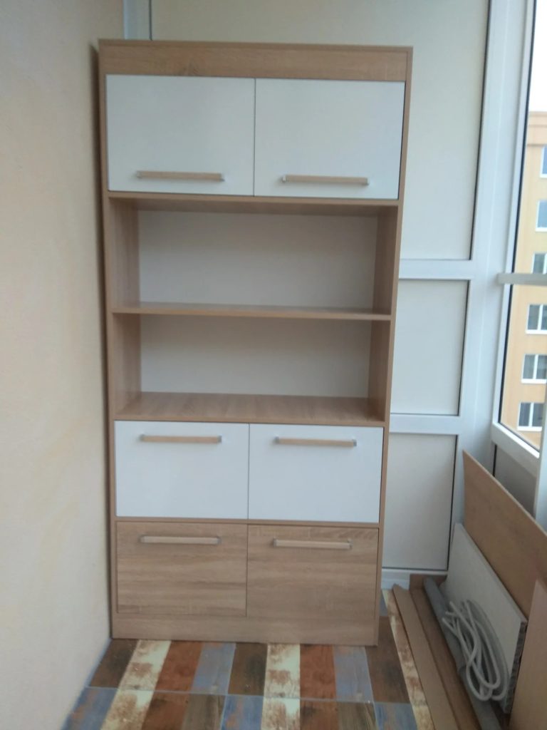 La structure de 195 cm de haut est en panneaux de particules mélaminés. La façade est partiellement finie en bois, les portes et le mur du fond sont laminés pour ressembler à du plastique blanc. Longueur des étagères - 93 cm, profondeur - 37 cm.