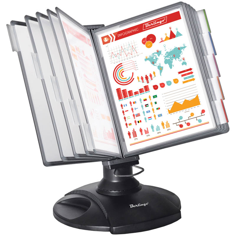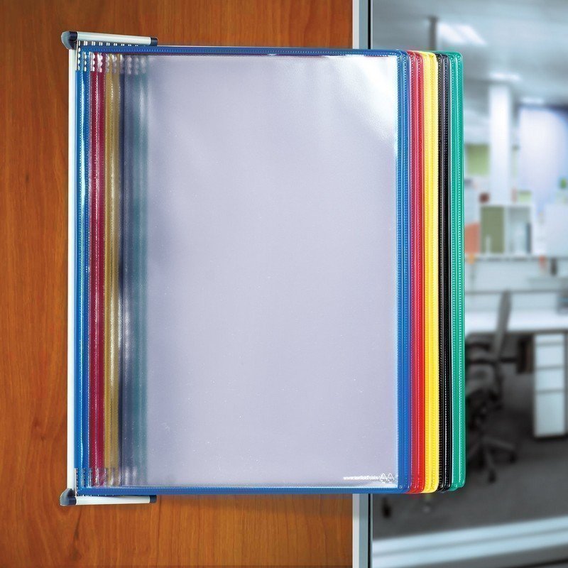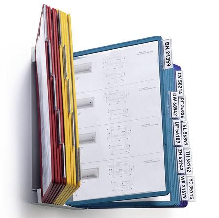 Système d'affichage mural de la société allemande Durable. La base est en métal, le cadre est équipé de vingt panneaux multicolores qui sont inclus avec le produit. Dans chacun des panneaux, il est possible de placer du matériel publicitaire et d'information au format A4 (le nombre total de feuilles prises en charge est de 40 pièces). Le type de montage mural permet d'utiliser le rack dans n'importe quel endroit pratique, y compris la zone de production. Pour faciliter la recherche, le pupitre est équipé de tabulateurs. Le coût moyen est de - 9 348 roubles.