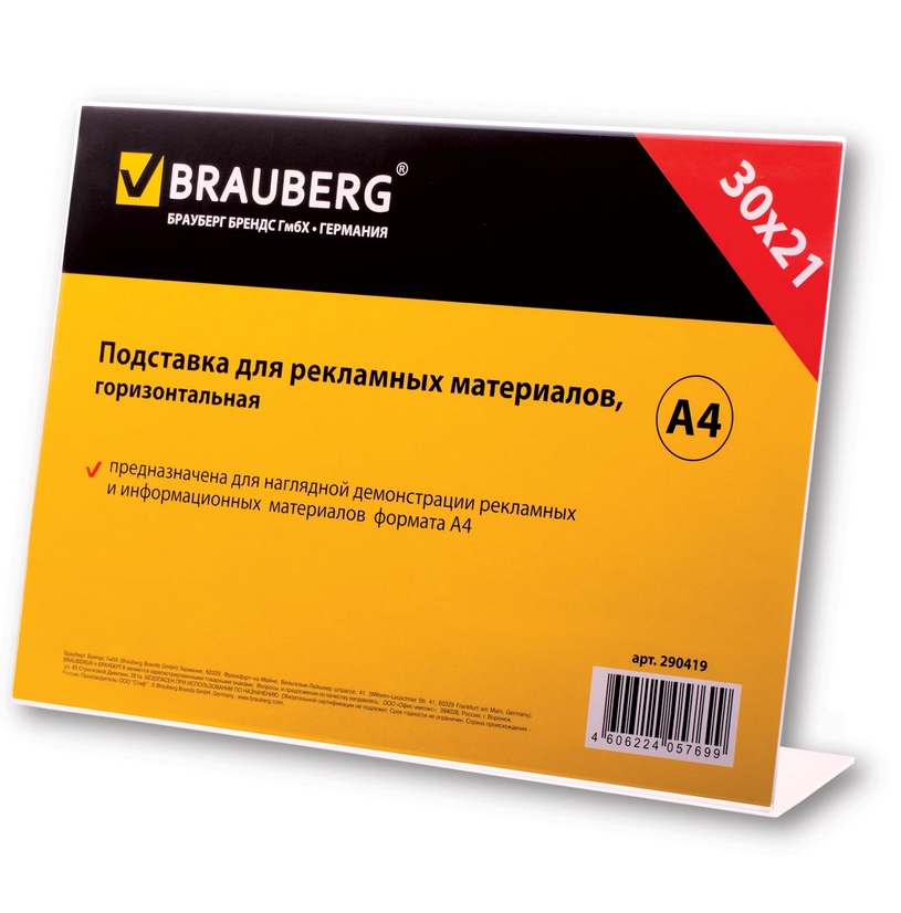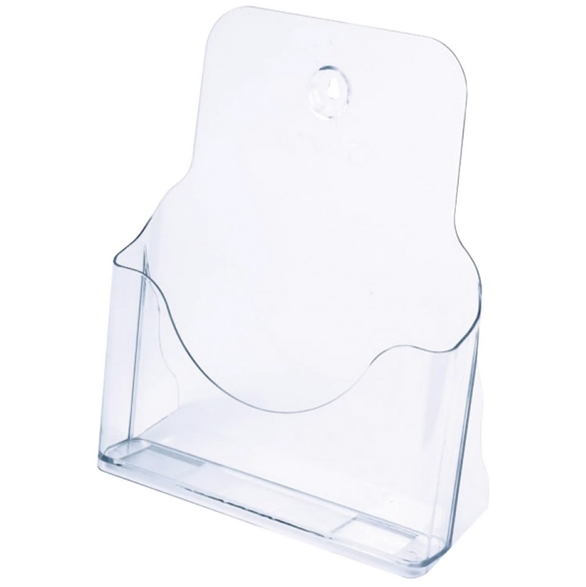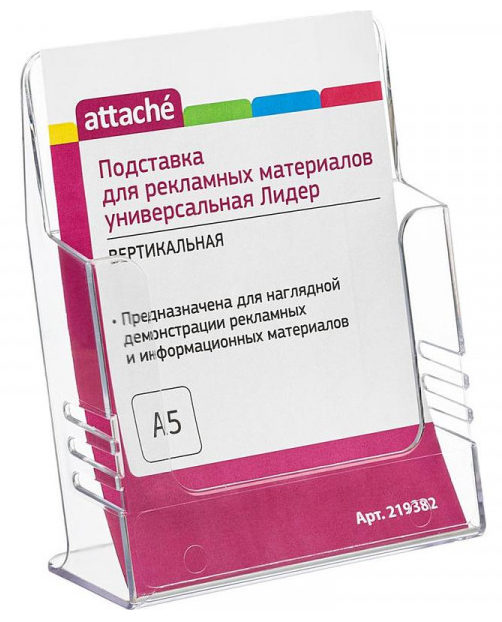 Support de bureau simple face pour la démonstration horizontale de matériel promotionnel, dépliants A4. Fabriqué en plexiglas transparent, a un compartiment. Taille du support - (hauteur, largeur, profondeur) 210 mm. Un tel rack est bien adapté pour placer de petits matériels promotionnels, des démonstrations de menus. Le coût moyen est de 444 roubles.