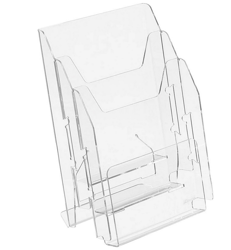 Support de table unilatéral pour le placement vertical de matériel publicitaire au format A4. La structure est en plexiglas transparent et comporte trois compartiments en cascade. La taille du produit est de 297 × 215 × 32 mm. Le coût moyen est de - 1 556 roubles.