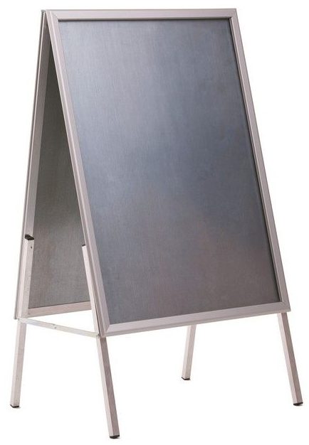 Rack intérieur d'un fabricant russe, qui est une structure en forme de A à deux côtés. Conçu pour le placement vertical et la démonstration de deux affiches publicitaires recto au format A1 (594×841 mm). L'affiche est fixée sous un film antireflet spécial à l'aide de cadres à profil à encliquetage.Grâce à sa forme, le pilier peut être placé sur le mur. Équipé d'un loquet interne qui s'enclenche en position ouverte.Le modèle est en aluminium anodisé et est vendu déjà monté. Couleur de conception - argent mat. Taille du rack - 630x1140x570 mm. Le coût moyen est de - 10 450 roubles.