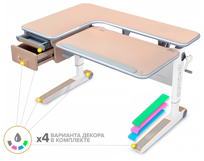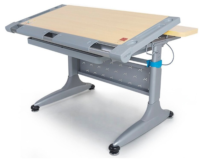 Le développement d'une marque bien connue se distingue par un large éventail de possibilités, vous permettant de vous asseoir confortablement sur le sol ou de tout mettre en position debout pour un adulte. Les paramètres sont réglés au moyen d'un mécanisme de levage actionné par un levier sous le couvercle.Complètement séparément, le débogage de la partie inclinée est effectué sous l'influence de l'élévateur à gaz allemand STABILUS. Grâce à cette solution, le design deviendra la meilleure option à la fois pour jouer avec des enfants sur le tapis et pour aménager la zone de travail d'un adulte.
