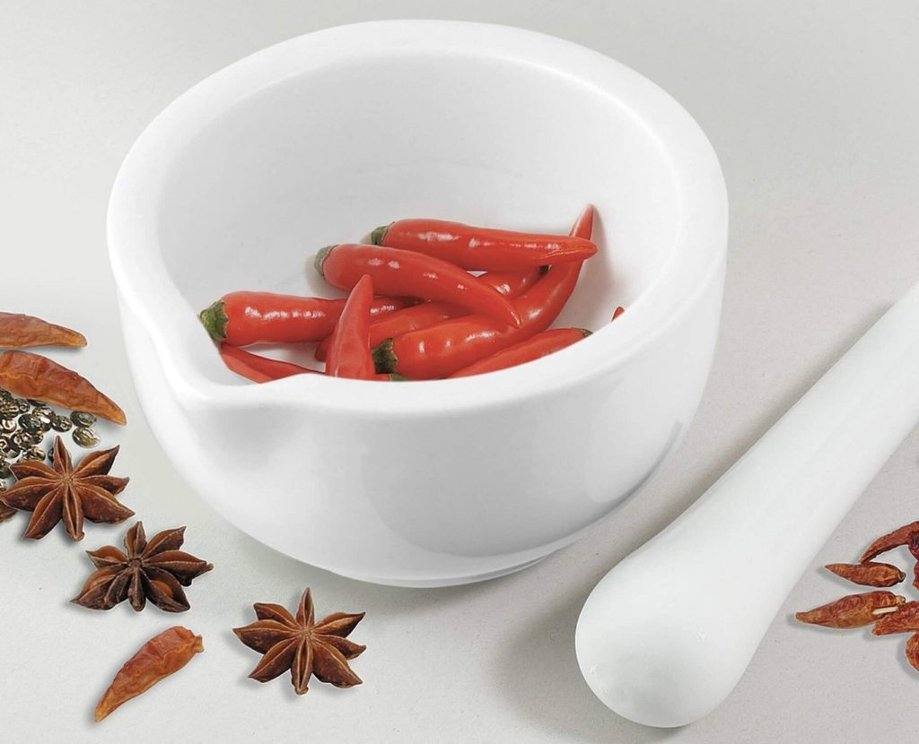 Le Fackelmann est en céramique et est idéal pour moudre divers ingrédients. La partie travaillante du bol et le pilon ont une surface rugueuse, ce qui facilite le processus de broyage, tout le reste est recouvert d'une glaçure blanche. Malgré la fragilité du matériau, avec une manipulation soigneuse, le produit durera longtemps.