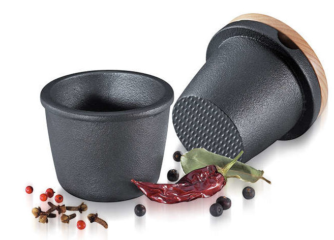 La société allemande Zassenhaus produit des mortiers en fonte de haute qualité. Le modèle Zassenhaus h-9 cm, d-8 cm convient au broyage de toutes sortes d'épices, d'herbes, de céréales, il peut créer des particules de broyage grossier et fin. Le récipient massif a une surface nervurée, ce qui vous permet de broyer rapidement et uniformément les composants. Pour faciliter le stockage du contenu résultant, les fabricants ont fourni un couvercle qui s'adapte parfaitement aux bords, empêchant les odeurs de se propager.