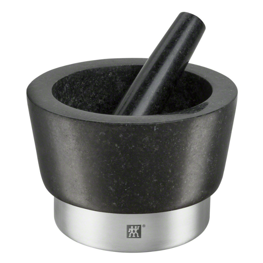 Le mortier de la marque allemande Zwilling J. A. Henckels est composé de pierre naturelle et d'acier inoxydable. La conception massive convient au broyage de toutes les épices, céréales, noix et herbes, il est facile à nettoyer, mais il ne peut être lavé qu'à la main, il ne convient pas aux lave-vaisselle. Produit dans de belles boîtes cadeaux.