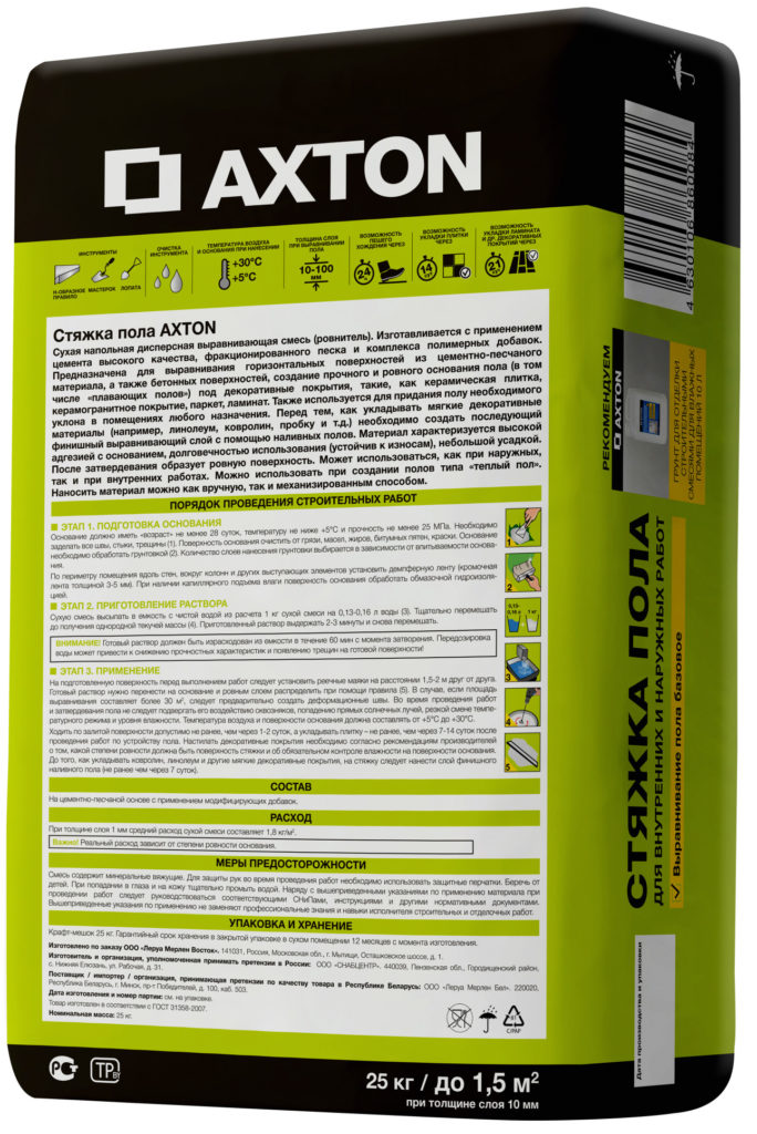 Les produits de la société russe, qui a fait ses preuves lors du nivellement du sol dans les locaux. Peut être utilisé à des températures de 5 à 30sur Celsius. La consommation du mélange est de 12 kg pour 1 m². M.