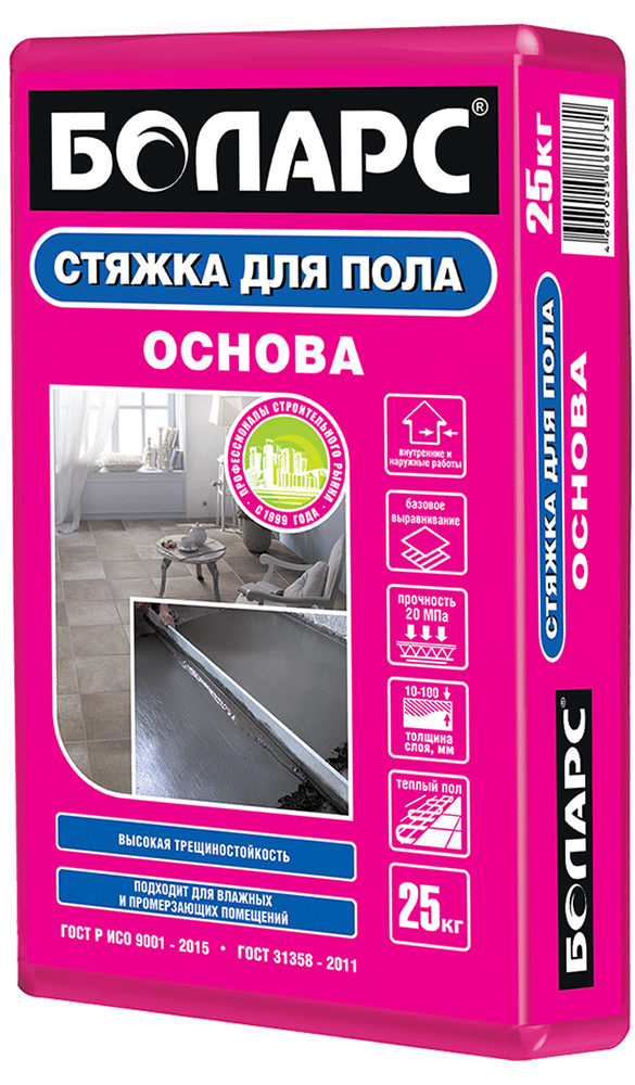 Produit de ciment à haute résistance d'un fabricant russe pour couler un sol de base d'une épaisseur de 10 à 100 mm à une température de 5 à 30sur Celsius. La consommation est de 18 kg pour 1 m². M.