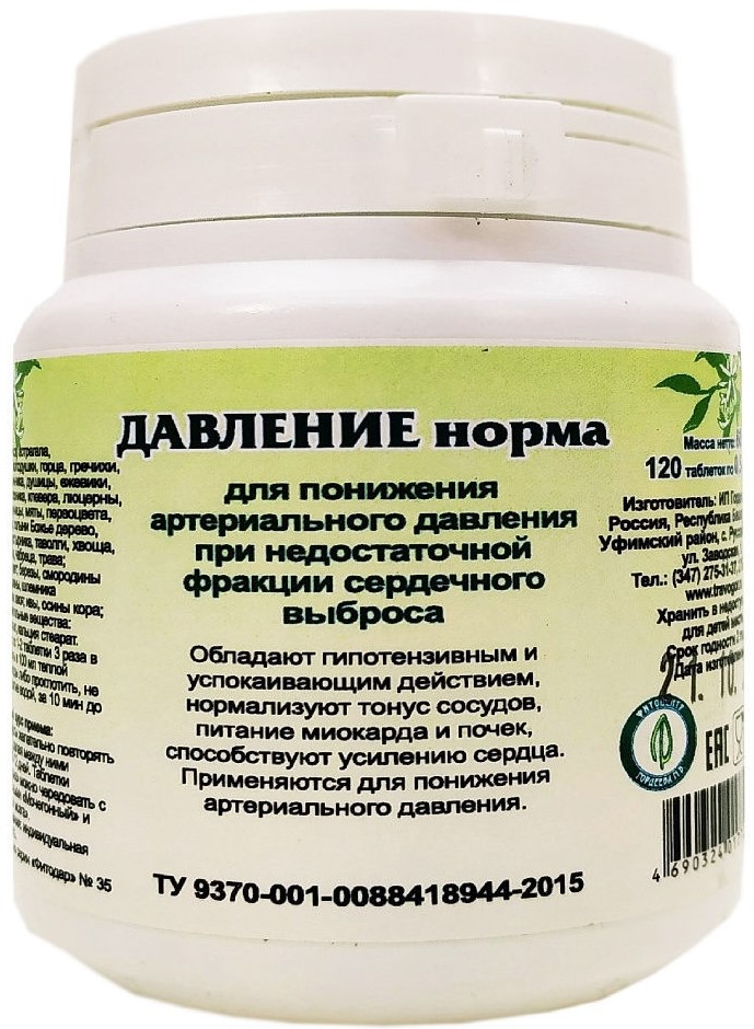 Les comprimés ont un effet hypotenseur et sédatif, aident à normaliser le travail du cœur et des reins. Avec un apport constant, ils réduisent le risque de sauts de tension artérielle. La composition ne contient que des ingrédients naturels et naturels cultivés sur les terres domestiques. Le cours est conçu pour 2-3 mois, puis vous devez faire une pause de 7 à 10 jours, puis répéter le cours. Prix : 559 roubles.