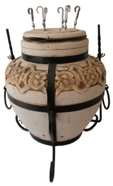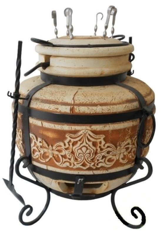 Le design de la cruche en terre chamotte répartit uniformément la chaleur à l'intérieur. Le cadre forgé protège les murs des fissures et des dommages mécaniques. Poisson, viande, barbecue, légumes - n'importe quel plat se révélera plus rapidement que sur un feu ou un barbecue. L'épaisseur de paroi de 5 mm fournira une chaleur à long terme sans allumage supplémentaire. Avec le poêle, l'acheteur recevra un ensemble de brochettes forgées, une grille, un tisonnier et une pelle pour le nettoyage. Les autres accessoires devront être achetés séparément. Le prix du modèle varie de 8 à 9 000 roubles.