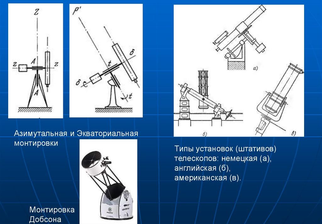 Les appareils avec une monture azimutale coûtent généralement un ordre de grandeur plus cher, mais permettent non seulement de considérer des objets sombres et éloignés, mais aussi de se livrer à l'astrophotographie. Le principal inconvénient de ces télescopes est leur grande taille et leur processus de configuration compliqué, ils ne conviennent donc guère aux débutants.
