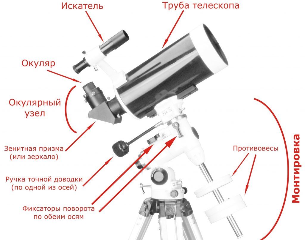 Mont - azimut, ne nécessite pas de réglages complexes. L'adaptateur intégré permet non seulement de prendre des photos de corps célestes, mais également de filmer des vidéos sur l'appareil photo d'un smartphone.Focuser - rack, avec des poignées confortables, qui peuvent être utilisées pour régler la position du tube optique.
