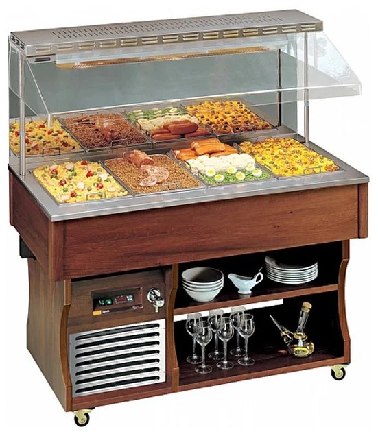 Les appareils thermiques sont encastrés ou posés au sol, ils peuvent être installés séparément ou alignés. Dans le même temps, la conception de la structure est d'une grande importance, car le buffet agit comme une grande vitrine, tous les appareils utilisés doivent être fabriqués dans le même style. Sinon, le modèle se démarquera et créera une sensation d'inconfort chez les gens. Cela peut devenir un inconvénient important et effrayer les clients.