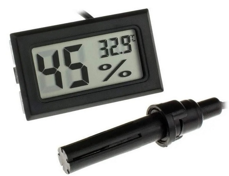 Un merveilleux appareil pour la maison, qui combine plusieurs fonctions. Le capteur d'humidité et de température est situé sur un long câble. Sa longueur est de 1,5 mètre, ce qui convient aux aquariums les plus profonds. Le câble est connecté à l'écran à cristaux liquides. L'écran est également assez grand et les chiffres sont bien visibles (taille de l'écran 35,7 x 16,8 mm). L'ensemble de l'appareil ne pèse que 25 grammes (sans piles). Pour l'alimentation, vous devez installer 2 piles de 1,5 volts (incluses). L'utilisation de l'appareil est très simple, après avoir allumé l'écran, il commencera immédiatement à afficher la température et l'humidité. Précision de mesure de température ± 1 degré, précision de mesure d'humidité ± 5%. Le coût recommandé pour les chaînes de magasins est de 590 roubles.