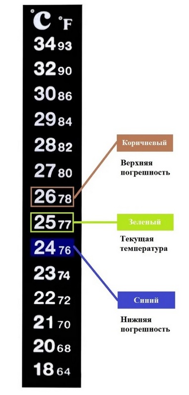 Le thermomètre autocollant 18-34 degrés TPH-1162 est un thermomètre spécialement conçu sous la forme d'un autocollant, conçu pour mesurer la température dans un récipient pour conserver les poissons d'ornement. Le thermomètre a une couche adhésive spéciale résistante à l'humidité pour le placement sur n'importe quelle surface lisse. Il est nécessaire de coller strictement en position verticale pour un affichage correct de la température.Le thermomètre autocollant a 2 échelles de température de couleur : 1) de +18 à +34 degrés Celsius ; 2) +64 à +93 degrés Fahrenheit.