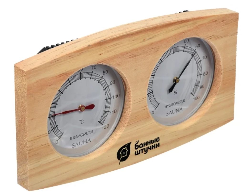 Le thermohygromètre est prêt à l'emploi immédiatement après le déballage, aucun étalonnage supplémentaire n'est nécessaire. Les cadrans sont intégrés dans un boîtier en bois, en plastique, le mouvement lui-même est en métal. Les échelles sont clairement lisibles, ce qui est important lorsqu'il y a de la vapeur dense dans le bain, les flèches de l'appareil sont de couleurs différentes.