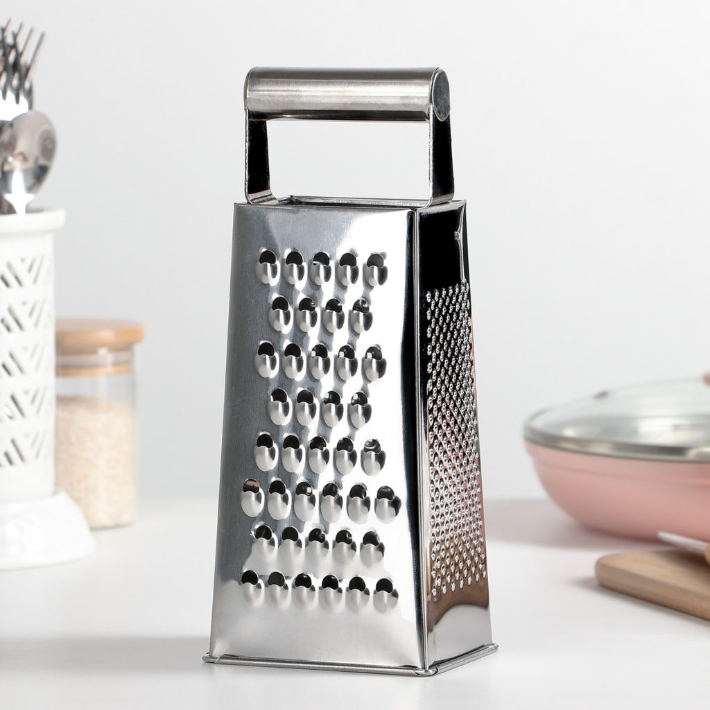 Lors du choix de l'étain ou de l'acier, faites attention à la qualité du métal. Remarqué affaissement, bavures, couverture inégale - recherchez une autre option. Les râpes en forme de pyramide (cube) peuvent être placées sur une surface plane et légèrement pressées - elles ne doivent pas chanceler et la poignée doit reposer confortablement dans la paume de votre main.