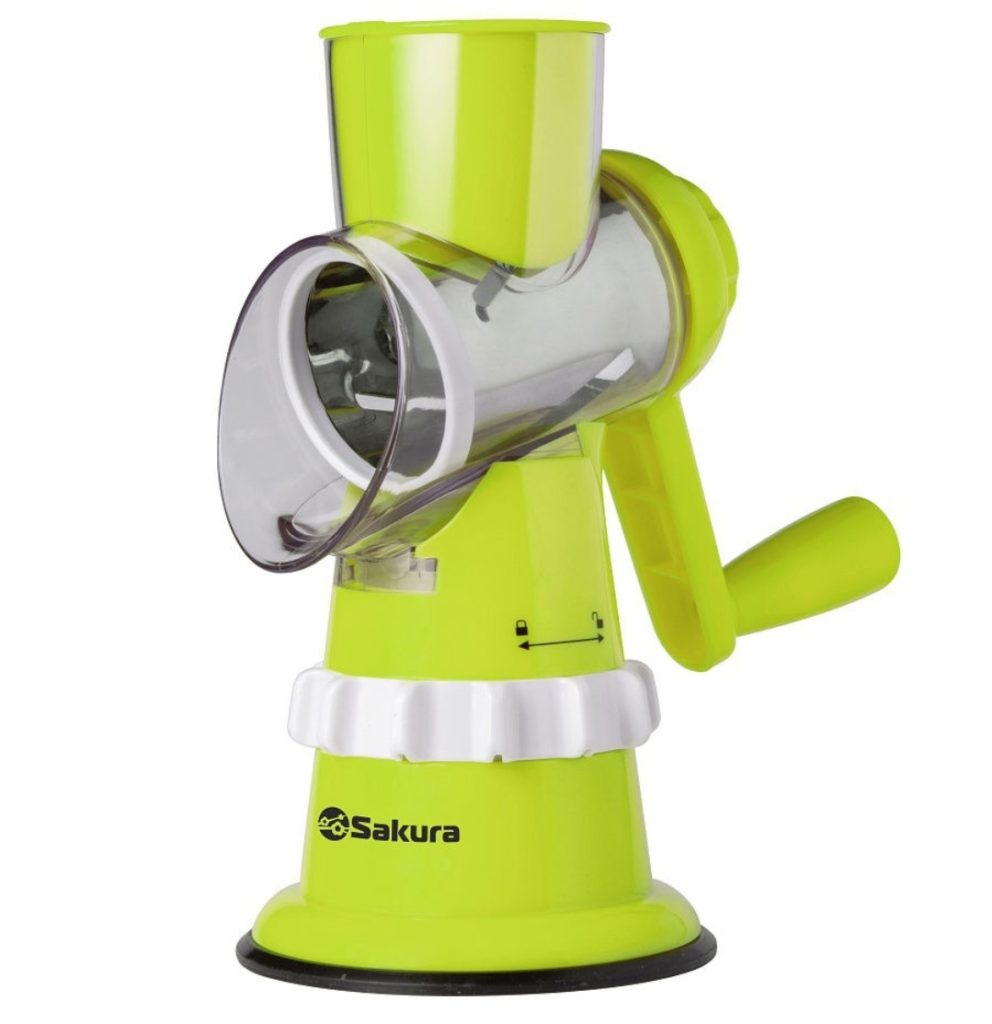 Compact, durable, avec un jeu de buses inclus. Convient pour déchiqueter, trancher les pommes de terre, les concombres en fines tranches. Selon le principe de fonctionnement, il ressemble à un hachoir à viande manuel classique, un poussoir en plastique est également inclus dans l'ensemble.