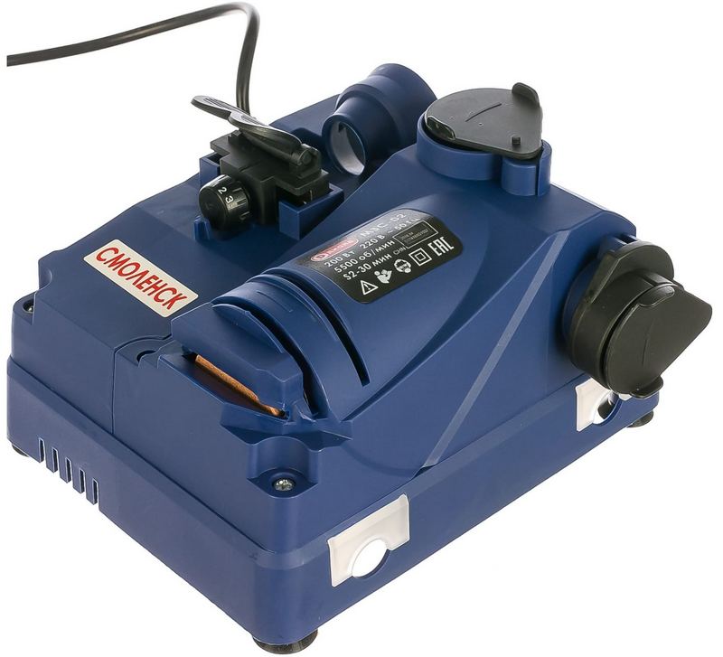 Cet appareil vous permet d'affûter l'outil le plus précisément possible grâce à la faible vitesse de rotation du disque. Cela réduit la génération d'étincelles et le risque de fonctionnement. Installé par défaut deux disques (inclus). L'outil peut être placé sur un établi ou sur toute surface stable et plane. Le prix recommandé pour les chaînes de magasins est de 17 900 roubles.