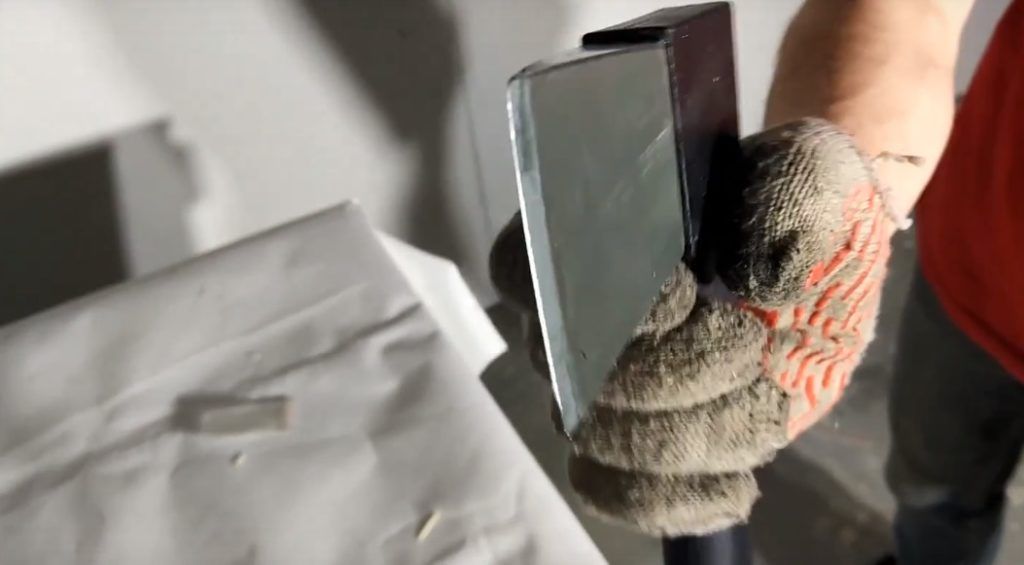 Le manche en fibre de verre renforcée avec un revêtement anti-friction rugueux, même mouillé, tient bien en main et ne glisse pas. Et pour plus de fiabilité, il y a un porte-paume en bas. À l'intérieur, il est creux, de sorte que la masse principale de l'outil est la pièce de travail, qui est en acier de haute qualité. Il a une prise en main sûre.