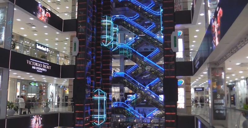 Sur une superficie de 283 000 mètres carrés, il y a 6 étages avec des boutiques, des divertissements, des cafés, des restaurants, ainsi qu'un parking pour 2 700 voitures. Au rez-de-chaussée, vous pourrez vous installer dans un café et admirer la belle et grande fontaine aux jets d'eau colorés. De plus, le plus grand jet de 32 mètres atteint un toit ovale transparent, qui offre une vue impressionnante sur les gratte-ciel de la capitale.