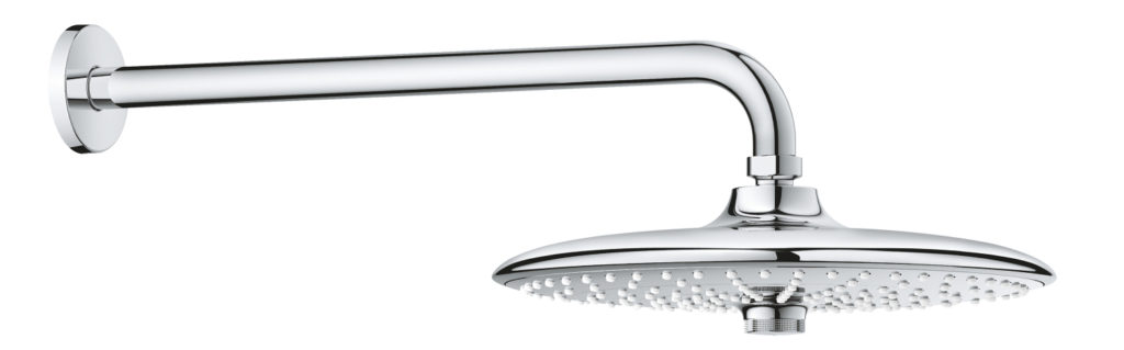 La buse d'un diamètre de 260 mm est fixée au mur à l'aide d'un support de tuyau. Hauteur d'installation 2100-2300 mm. La pomme de douche tourne dans différentes directions sur un support articulé. Le changement de mode se fait d'un seul mouvement de la main - en tournant l'interrupteur au centre du diffuseur.