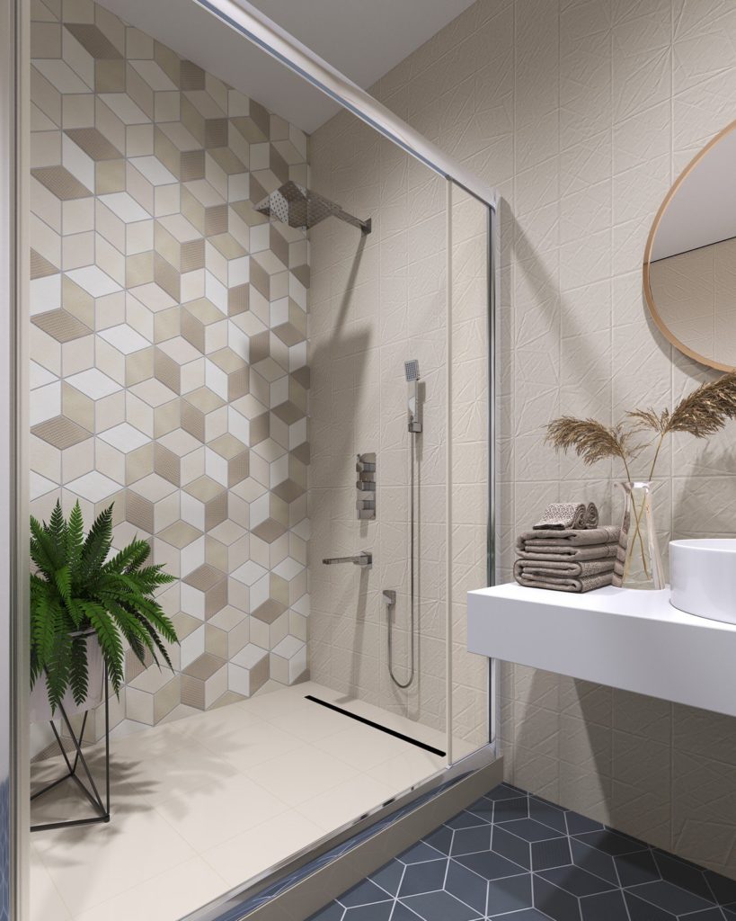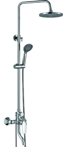 Colonne de douche avec mitigeur à levier. La douche de tête à effet pluie est montée sur un tuyau chromé, qui sert également de support. La hauteur de l'arrosoir est ajustée à la taille d'une personne, la distance optimale est sélectionnée pour un arrosage confortable avec des jets.
