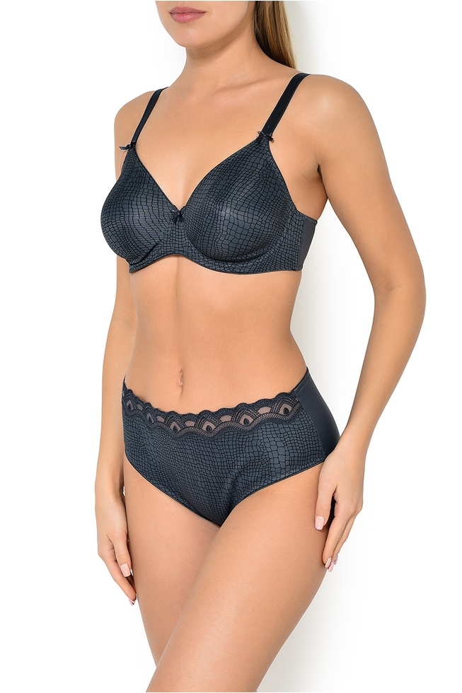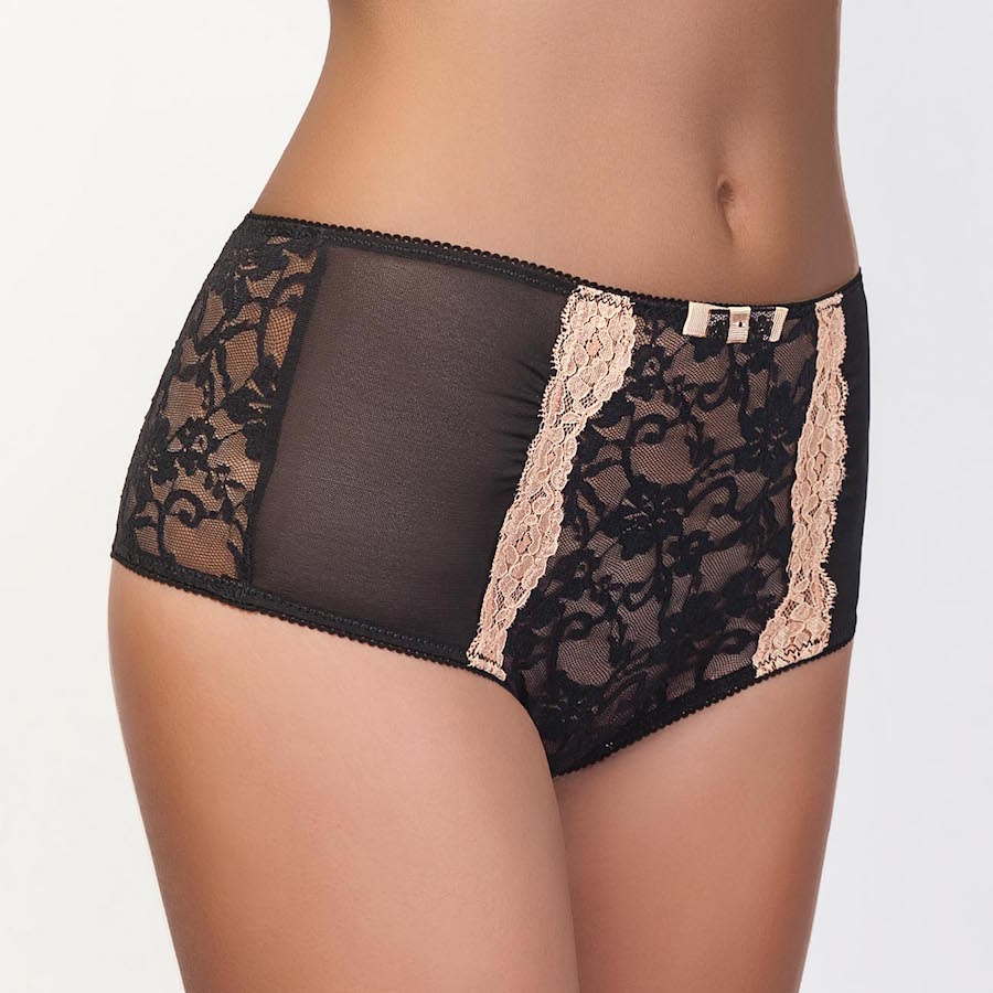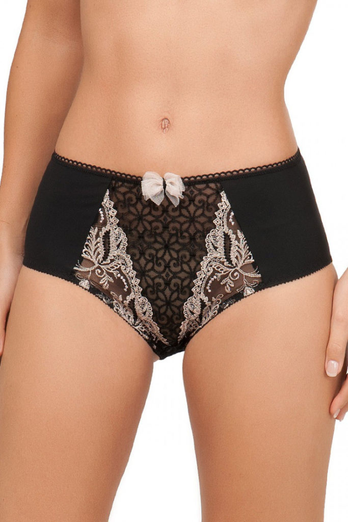 La culotte est en polyester et polyamide avec ajout de lycra et de coton. Les hanches sont rehaussées de délicates broderies, tandis que le devant présente un bel empiècement en tissu brodé, du tulle plissé et un nœud en mousseline. La taille est soulignée d'un élastique décoratif. Une lingerie intime élégante et gracieuse avec un gousset doux de haute qualité et une taille classique, se décline dans une gamme de taille universelle du 42 au 52 et quatre couleurs : noir, ambre nuit, poudré et paradisiaque. Suppose la possibilité d'acheter un ensemble avec un soutien-gorge.