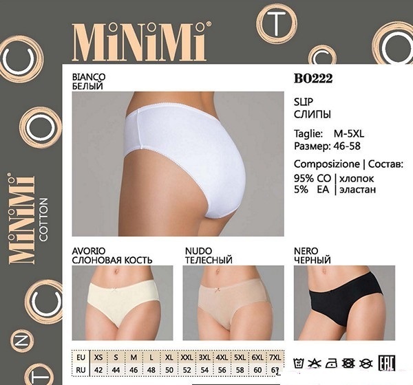 Les classiques du développeur italien MiNiMi sont fabriqués en coton hautement hygiénique et offrent un confort de port maximal. Le textile appliqué n'est pas sujet à la déformation et au pelage. Les bords des produits sont finis avec des élastiques doux avec des festons en dentelle. Produit délicat et agréable au toucher, fournit une grille de taille de 42 à 52 tailles et quatre couleurs : avorio (ivoire), blanc, chair et noir. Les nuances de base du lin contribuent à sa combinaison réussie avec presque tous les vêtements.